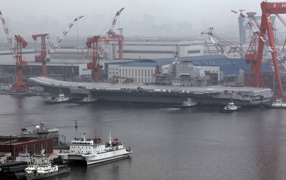 8月10日,中国航母平台进行出海航行试验。按照试验计划,首次出海试验时间不会太长,返回后将继续在船厂进行改装和测试工作。图为拍摄于大连的中国航母平台(资料照片)。 新华社发