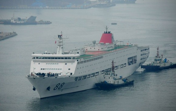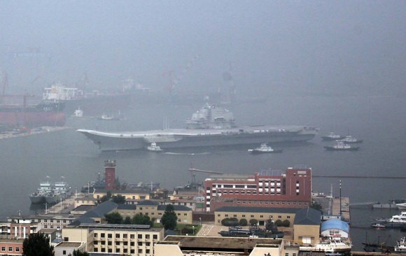 2011年8月14日,大连,在薄雾的掩衬下,中国首艘航母在7艘拖船的协助下缓缓地靠向码头。【资料图】