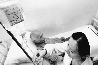 作为天津市养老院中的首家医保单位,和平区劲松护养院招聘了一批有资质的医生和护士,24小时值班。上图为该院医护人员在为病人输液。 李世琦 摄