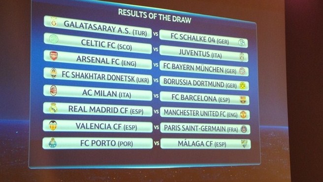 本届欧冠16强两周前决出,卫冕冠军(切尔西)首次无缘淘汰赛。8支获得小组第一的球队(种子队)是巴黎圣日耳曼、沙尔克04、马拉加、多特蒙德、尤文图斯、拜仁慕尼黑、巴塞罗那、曼联;8支以小组第二出线的球队是波尔图、阿森纳、AC米兰、皇马、顿涅茨克矿工、瓦伦西亚、凯尔特人、加拉塔萨雷。16支球队分别来自9个足协,西甲独占4席,甲球3队全部夺得头名,英超和意甲各有2队晋级,法甲、葡超、苏超、土超和乌超各占1席。