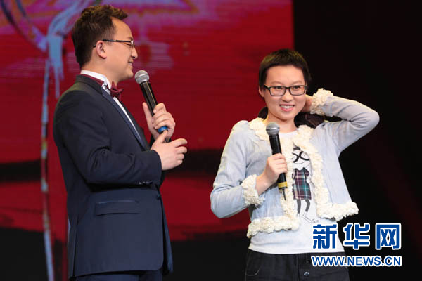 1月8日,山西临汾巿蒲县放弃高考“割皮救父”的17岁女孩王慧(右)在颁奖会上。当晚,2012“感动山西”十大人物颁奖会在山西太原举行。近日,一个19岁的女孩为了给烧伤的父亲植皮,不惜将自己的头皮献出的故事在网络上引起轰动,不少网民把这名“献皮救父”的孝顺女孩称为“最美女儿”。新华社记者武敌摄