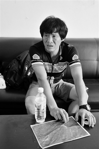 杨邦革指着卫星地图,向记者讲述搜救方位。魏一晓/摄