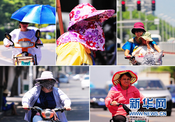 8月5日,福州市民“全副武装”,抵挡烈日炙烤(拼版图片)。 当日, 福州市大部分县(市)最高气温达37℃以上,其中福州市区、内陆和沿海北部最高气温达38至40℃,局部超过40℃。福州市气象台9时发布高温红色预警信号,提醒相关部门做好应对工作,市民尽量避免在10时到17时之间出行并注意防暑降温。据福州市气象台介绍,这是福州市有气象预警信号以来发布的首个高温红色预警信号。新华社记者魏培全摄