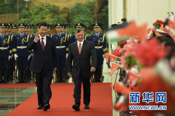会谈前,习近平在人民大会堂北大厅为阿卜杜拉二世举行欢迎仪式。全国人大常委会副委员长艾力更·依明巴海、国务委员杨洁篪、全国政协副主席马飚等出席。