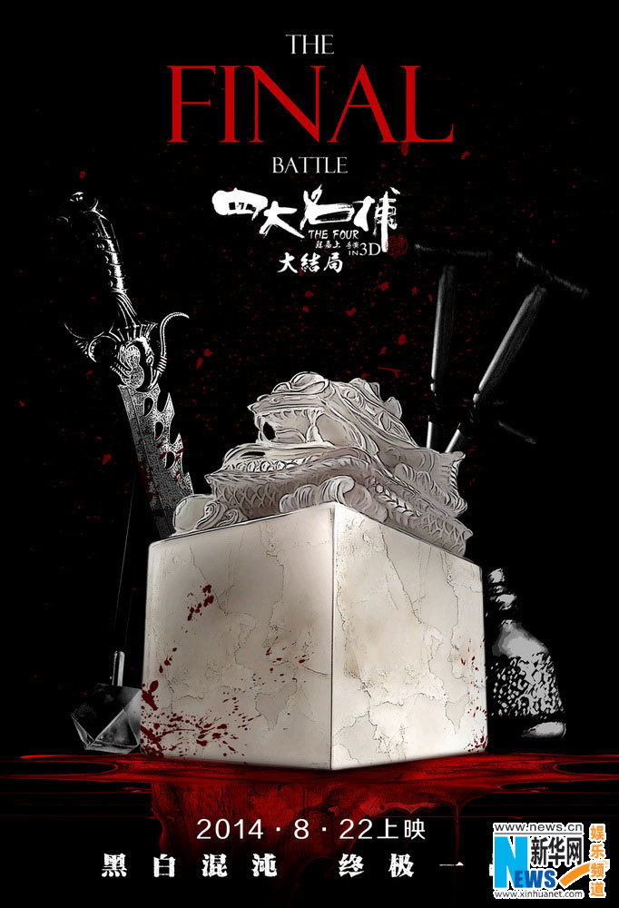 3D新魔幻武侠巨制《四大名捕大结局》宣布定档8月22日,缺少武侠电影的2014年影市终于武侠大片重磅来袭。该片由光线影业出品,导演陈嘉上携原班人马,邓超、刘亦菲、邹兆龙、郑中基、黄秋生、吴秀波、江一燕、柳岩、包贝尔、吴映洁等最终集结,新角色苏有朋变身帝王强势亮相,共同奉上大结局。日前片方发布定档预告片及概念版海报,概念海报上“The Final Battle”与“黑白混沌 终极一战”两句正式宣告:终极悬疑、终极特效、终极揭秘、终极对决——终极魔幻武侠大战今夏震撼炫目上演。