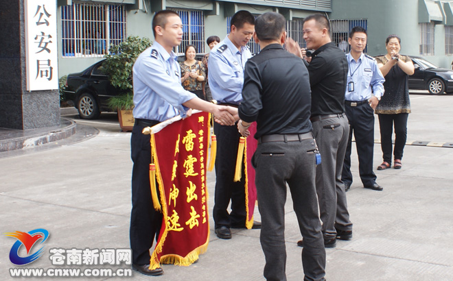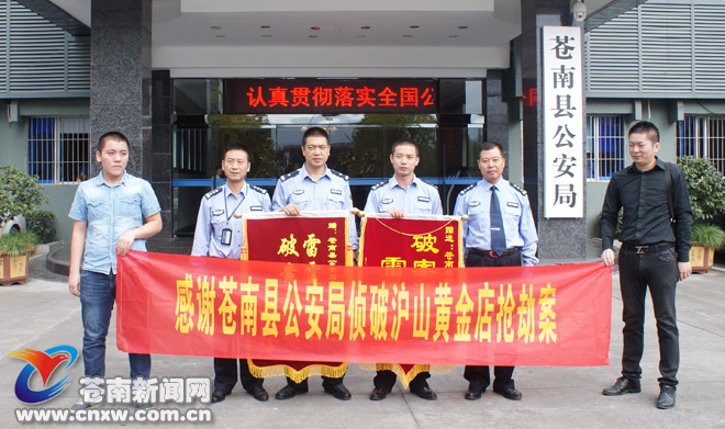 苍南新闻网11月3日消息:10月30日上午,灵溪沪山社区“9·13”金店被劫一案受害人周先生及家属一行20余人拉着“感谢苍南县公安局侦破沪山黄金店抢劫案”的横幅及两面绣有“雷霆出击、破案神速”的锦旗,踏着铜管乐队的乐声,专程来到县公安局大院对专案组民警一个多月来放弃休息、连续作战直至成功破案并追赃表示感谢。