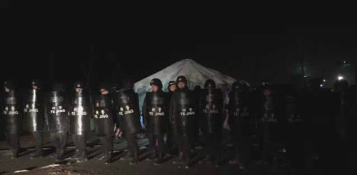 30日凌晨2时许,在多次劝说无果的情况下,苍南警方当机立断,架起人墙将闹事人员和停尸棚隔开,并对停尸棚进行拆除,同时对挑头人员进行强制传唤,确保了交通主干道的通畅。