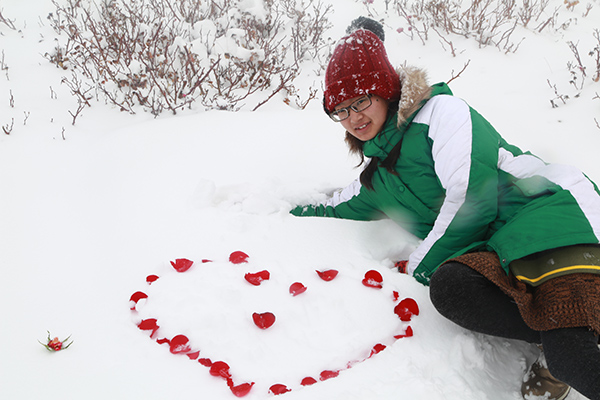 游客与雪地里用花瓣拼出的心形图案合影记者唐典/摄