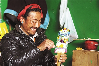 普布次仁来自仁布县普松乡夺索村,传统的“孜卓”(酥油花)制作技艺一直在当地农牧民手中传承。依靠这一门手艺,普布次仁每年藏历新年前都会和亲戚“组团”来拉萨制作销售“酥油花”,50元左右一对的“酥油花”,一人一天可以制作15对以上,收入可观。图为普布次仁在制作“酥油花”。常川/摄