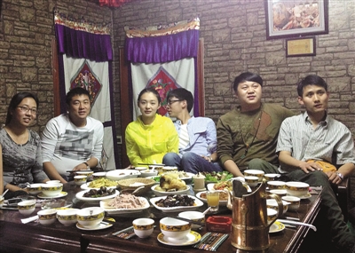 在藏家宴,来自五湖四海的游客们不仅可以品尝到藏族美食,而且可以了解西藏的风土人情。图为拉木藏家宴里,游客们尽情品尝西藏美食。洛桑次旺/摄