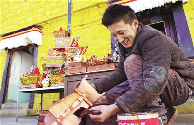 来自达孜县的布琼入行做藏式家具6年多时间,制作“切玛盒”已成为他每年藏历新年前少不了的工作,可观的销量总能为他增加不少收入。图为布琼正在自己的家具店前为“切玛盒”刷底漆,身后的货架上摆满了待售的年俗用品。常川/摄