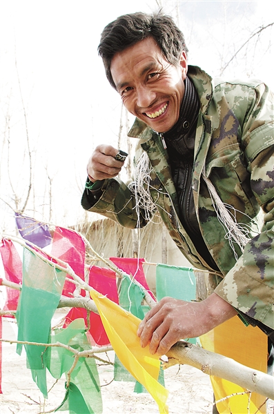 朗珠来自浪卡子县打隆镇,趁着农闲来到拉萨制作出售“塔觉”(经幡树),一个“塔觉”售价平均在120元左右,一个月朗珠可以收入1万多元,藏历新年家家户户要换新的“经幡树”也成了朗珠的“发财树”。图为朗珠在赶制“塔觉”。常川/摄