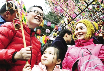 上图 2月23日,一个三口之家正在逛北京地坛庙会,感受北京庙会的特色文化。本报记者 李树贵摄