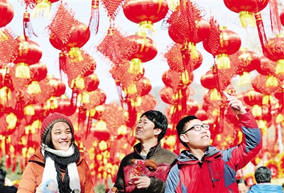 右图 2月23日,游客在北京八大处公园文化祈福庙会拍照留念。 本报记者 赵 晶摄