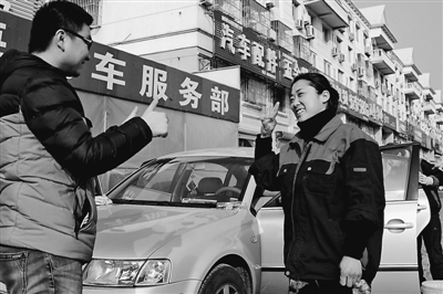 看到顾客竖起大拇指,是洗车店聋哑工人们最开心的事。本报记者贺勇摄