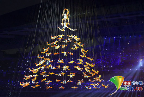 南京青奥会开幕式上,由200多名年轻演员构成“筑梦之塔”震撼亮相,掀起了开幕式的最高潮。资料图