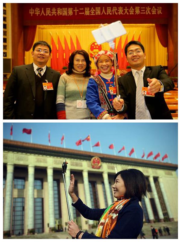 2015年两会,小小的自拍杆大大“火了”一把。会场内外,时常可见其踪迹。(图片来自新华社)