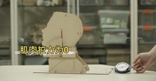 他将两只重量为0.5kg的水晶球放入模型内,代表头部的重量。附上量角器测量头部角度的变化,并将测力计系在白绳的一端,检测拉力的变化数值。当头部垂直于颈椎时,此时肌肉的拉力为0,即目前颈椎所承受的重量全部来自于头部,也就是0.5kg。随后开始增加低头的角度。当头低至15度的时候,测力计的数值为0.5kg,此时,颈椎的受力为头部重量与肌肉拉力之和,即1kg,也就是说此时颈椎所受到的压力为垂直时的2倍。继续加大角度,在角度达到45度时,颈椎的所承受的压力达到了1.85kg,为垂直时的3.7倍。此时颈椎承受的重量达到了29.6公斤。