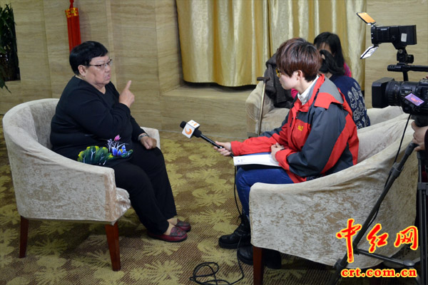 贺炳炎之女贺北生(左)在接受吕梁电视台的采访,畅谈此次吕梁山之行的感受。(中红网江山摄)