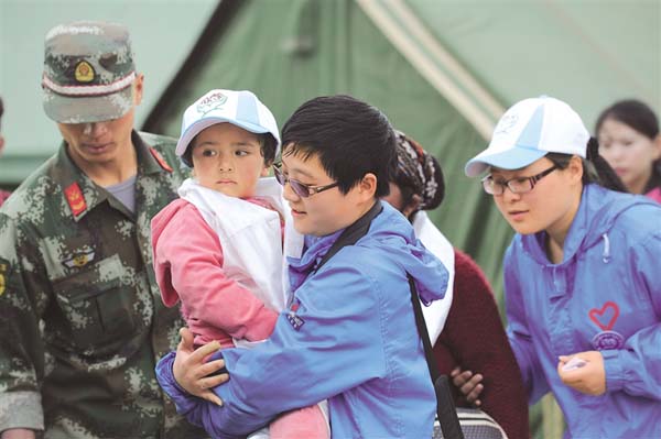 图为日喀则市桑珠孜区的青年志愿者正在帮助3岁的嘎玛央宗安置。记者次旺李洲唐斌丹增群培摄