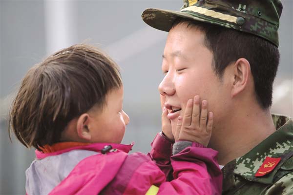 5月14日上午,吉隆县吉隆镇江村的4岁小男孩次仁康珠在转移前抱着日喀则边防支队桑青边境检查站张耀杰的脸舍不得放开。当日上午,日喀则吉隆县江村61名群众安全转移至吉隆镇安置点。郑永波记者王杰学摄