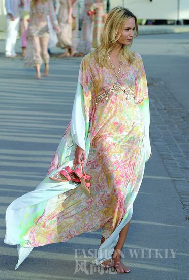 2.曳地长裙卷土重来:长裙又回来了!每过几季,曳地长裙势必回归众人视线;上一次流行还是2008春夏,今季这种淹没脚踝的裙长再度受到一众设计师的青睐,Nicolas Ghesquière也加入热烈拥护长裙的行列,此前他曾经在Balenciaga度假系列推出礼服式长裙,但近几季成衣系列并无尝试;在CHANEL,开场造型即是一袭洋溢嬉皮风格的印花长裙,淋漓展现了1970年代的随性与不羁。