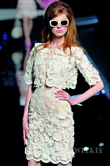 3.重磅蕾丝:2008秋冬,Prada凭借重磅镶嵌蕾丝惊艳全球,今季这种特殊材质回归T台,势如破竹。在Christian Dior,白色蕾丝套装裙乃是高级定制,Marc Jacobs的镶嵌蕾丝裙采用暗哑的蜜糖色调,水晶状凸起模拟出精巧的雕花刺绣效果。