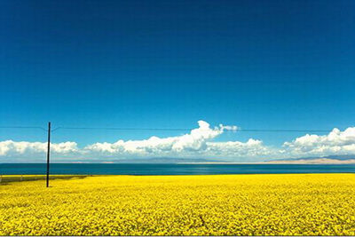 开车快到青海湖时,青藏公路好似平原上的公路,笔直向前,两旁的油菜花黄得逗人喜爱,一眼望去,大片大片,没有尽头。蓝色的湖水,蓝蓝的天空,翻滚的白云,加上黄色油菜花的衬托,实在是美。