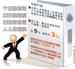根据一些专家和社会公众的意见,这次个税法草案二审稿有一处重要调整,即将个税税率第一级由一审稿规定的5%降到了3%。小小两个百分点,将使工薪所得纳税人中70%较低收入人群在起征点提高到3000元的基础上,享受到更多的减税优惠。