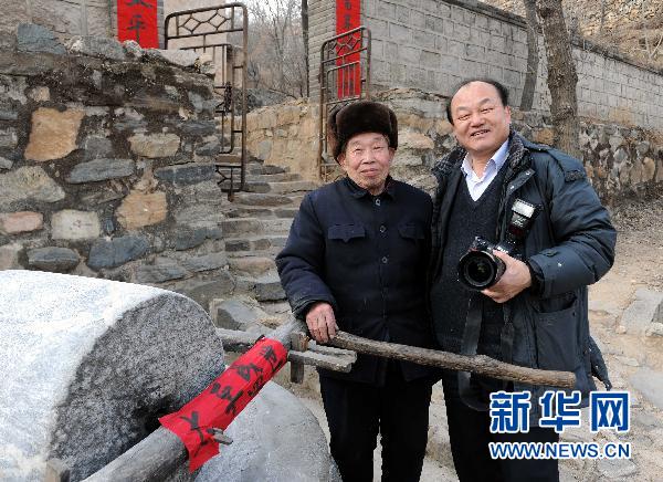资料图:新华社记者陈树根(右)在晋察冀革命老区河北阜平县花山村与当年和毛主席为邻的张冀新老人合影。 新华社发(叶烨摄)