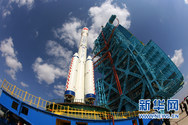 9月20日,天宫一号目标飞行器、长征二F运载火箭组合体以每小时22米左右的速度,行进1500米,于10时09分钟到达发射架。当日,中国载人航天工程新闻发言人宣布,我国将实施载人航天工程首次空间交会对接任务,执行任务的天宫一号目标飞行器、长征二F运载火箭组合体已从酒泉卫星发射中心垂直总装测试厂房顺利转运至发射区。天宫一号将于9月27日至30日择机发射。新华社记者秦宪安摄
