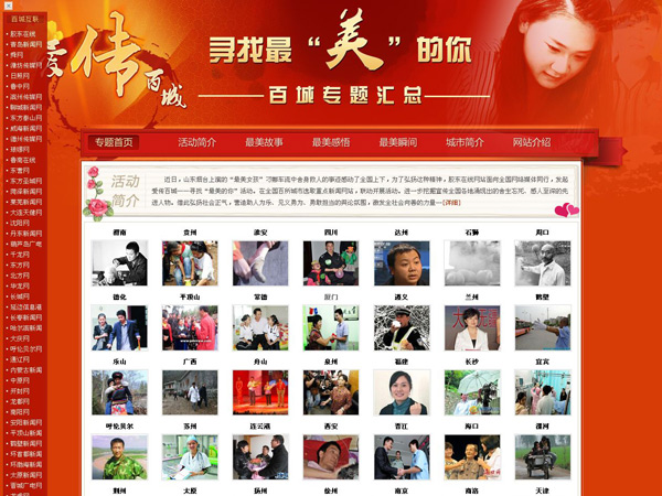 12月1日,为了弘扬山东烟台“最美女孩”刁娜舍身救人的精神,由百家城市网站参与的“爱传百城——寻找最美的你”活动在烟台广播电视大厦启动。中国网盟各成员单位在网站首页同步推出来自全国各地不同行业、不同阶层的“最美”人物,一个个爱心故事迅速在互联网上传播。