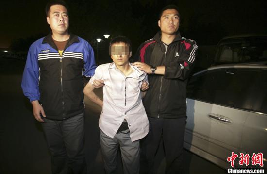 资料图片:2011年5月11日,北京市警方抓获犯罪嫌疑人。11日19时40分,北京市公安机关经过缜密侦查,并综合运用科技手段,在丰台区友联时代网吧将犯罪嫌疑人石柏魁(男,1983年出生,山东省曹县人)抓获归案,历时58小时迅速破获故宫博物院斋宫诚肃殿展品被盗案。中新社发 张岩 摄