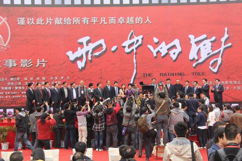 据记者了解,《雨中的树》由中影集团投资拍摄,前期经过3个多月的紧张筹备,4月10日正式开机。该片由韩三平担任制片人,导演尹力和编剧刘恒联手打造,王志飞、丁柳元、王成阳、刘佩琦、宋晓英、雷恪生、闫妮、丁嘉丽等人主演。韩三平介绍说,该片集结了国内一流的电影制作、宣传团队倾情打造,是中影集团今年投资拍摄的大型主旋律影片之一,将作为向党的十八大献礼片重点推出,预计今年9月底在全国上映。