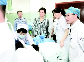 图为将车祸中受伤伤员送到医院的舒晓琴(中)。 孙春涛摄