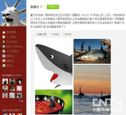 6月29日,有微博认证网友@张醒生称:"国务院机关事务管理局已正式发函(国管函(2012)21号)给全国人大代表丁立国 ,对丁立国联合三十多位人大代表提出《要求制定禁止公务和官方宴请消费鱼翅规定的建议》表示感谢和支持,并明确说明将发文规定公务接待不得食用鱼翅。"此微博一出立刻引发网友广泛关注和评论。