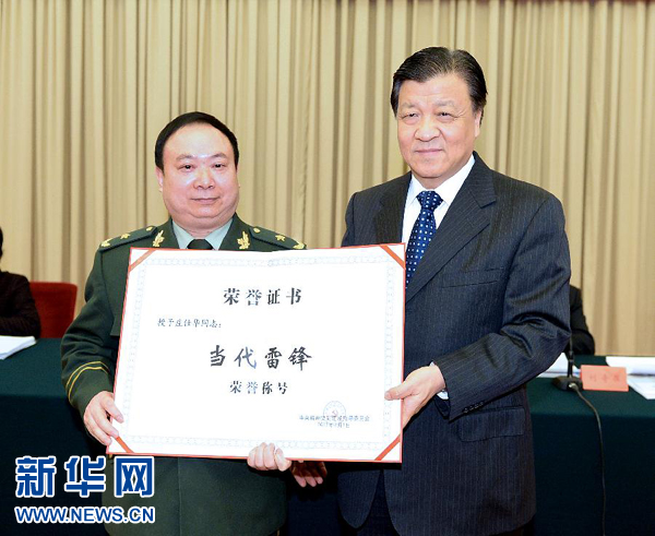 3月1日,中央精神文明建设指导委员会在北京召开纪念毛泽东等老一辈革命家为雷锋同志题词五十周年座谈会。中共中央政治局常委、中央文明委主任刘云山出席会议并讲话。这是在座谈会上,刘云山为获得“当代雷锋”荣誉称号的庄仕华同志颁发荣誉证书。新华社记者 李涛 摄