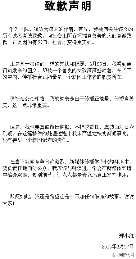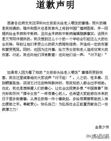 “深圳90后女孩给乞丐喂饭”假新闻涉事者发表道歉信