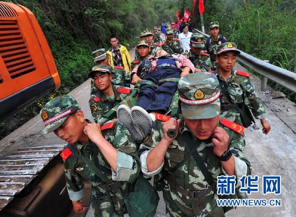 4月21日,武警四川总队第一支队七中队的战士在宝盛乡抢救一名村民。 “4·20”芦山地震发生后,芦山县宝盛乡受灾严重。目前,救援队员仍在搜救伤员、抢通道路和抓紧恢复通讯中。 新华社记者 肖艺九 摄