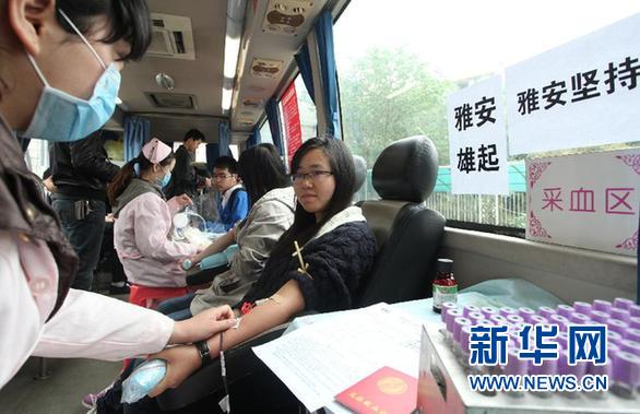 4月21日,湖南衡阳南华大学的大学生在献血。 当日,南华大学开展“献出青春热血,抗震救灾,支援雅安”专项献血活动,在校大学生积极为“4·20”四川芦山地震灾区伤员献血。 新华社发(曹正平 摄)