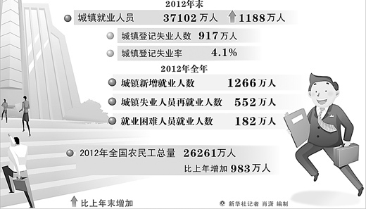 去年以来,尽管经济增速放缓,但就业表现不俗。全年城镇新增就业人数1266万人,城镇失业人员再就业人数552万人,就业困难人员就业人数182万人。年末城镇登记失业人数为917万人,城镇登记失业率为4.1%。全年全国共帮助5.86万户零就业家庭实现每户至少一人就业。全国农民工总量达到26261万人,比上年增加983万人,其中外出农民工16336万人。2012年末,外出农民工人均月收入水平为2290元,比上年提高241元,增长11.8%。