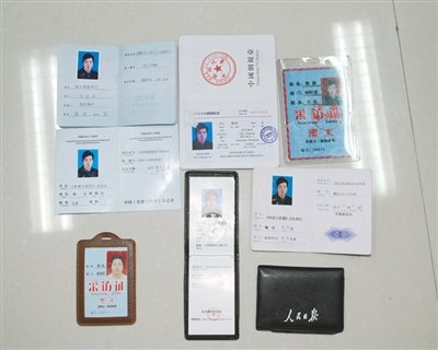 犯罪团伙制作的假记者证和工作证。徐州警方供图(图片转自:新京报)