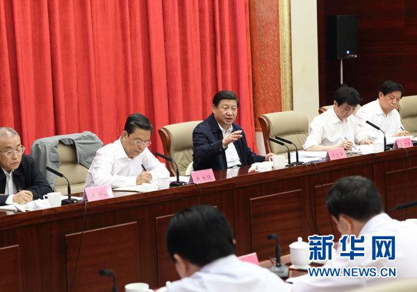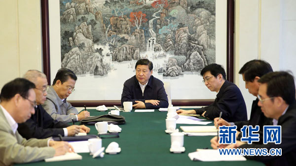 9月23日至25日,中共中央总书记、国家主席、中央军委主席习近平到党的群众路线教育实践活动联系省河北,全程参加并指导省委常委班子专题民主生活会。这是23日上午,习近平听取中央督导组关于河北省委教育实践活动情况汇报。新华社记者兰红光摄