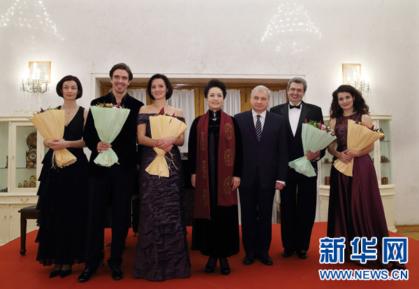 11月19日,国家主席习近平夫人彭丽媛应邀出席在俄罗斯驻华使馆举行的纪念柴可夫斯基俄罗斯歌剧晚会。这是演出结束后,彭丽媛同俄罗斯歌唱家合影。新华社记者兰红光摄