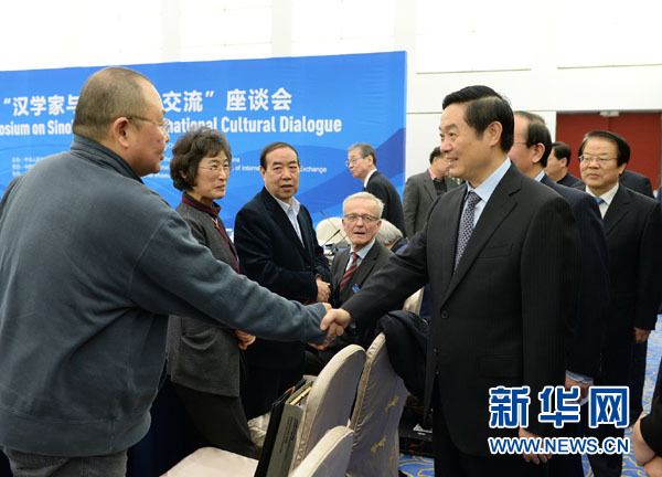 12月4日,中共中央政治局委员、中宣部部长刘奇葆与来华参加“汉学家与中外文化交流”活动的各国汉学家座谈。这是刘奇葆同与会汉学家握手。新华社记者马占成摄