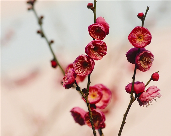 整个百草园像个度假村,依山傍水,一个精致的庭院,梅花错落有致,红白相间,依稀还有婆娑竹影,很容易找到这片梅树,有三株已经竞相开放了,雨中赏梅别有一番情趣。沾着雨水的花朵更有一份清灵和脱俗,我端起了长焦镜头,觉得我仿佛也成了一朵梅花,穿着粉红的衣裳,在料峭的寒风细雨中昂首怒放。