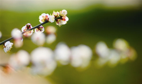 山寒水瘦之时,心情不免有点失落,但池边的一片嫣红映入眼帘时不免一阵心动,红梅绽枝头,“酒晕无端上玉肌”,淡淡的花香沁人心脾。满树的梅花一朵又一朵:有的才展开两三片花瓣儿,有的花瓣儿全展开了,露出了嫩红精致的花蕊,有的还是花骨朵,饱胀得马上就要裂开似的……梅花倒影在水里,是别处赏梅不曾见到的,远处有水鸭悠闲地游进我的镜头,我开心地笑了,好一幅“春江水暖鸭先知”的画卷。