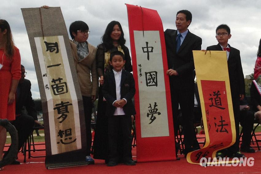 资料图片:2013年国庆节,张圣博参加华盛顿第十五届中国文化节,展示书写的“中国梦”作品(千龙网发)。