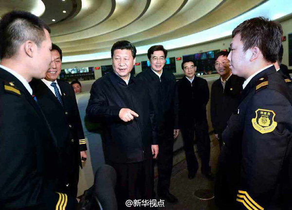 新华网北京2月25日电 据新华社“新华视点”微博报道,近年来,北京市轨道交通发展迅速。习近平来到北京市轨道交通指挥中心调度指挥大厅。宽阔的圆形大厅里,10多块巨型显示屏环绕四周,实时反映10多条轨道交通线的运行情况。总书记来到地铁10号线指挥台前,和工作人员亲切交谈,了解客流量计算方法,察看线路运行情况。