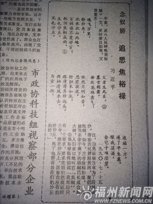 1990年,习总书记在榕时,写下追思焦裕禄的一首词《念奴娇 追思焦裕禄》,并作了注释,发表在当年7月16日的《福州晚报》上。
